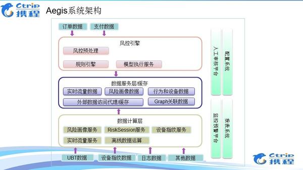 目前携程利用自主研发的风控系统有效识别、防范这些风险。携程风控系统从零起步,经过五年的不断探索与创新,已经可以有效覆盖事前、事中、事后各个环节。也从原来基于“简单规则+DB”,发展到目前能够支撑10X交易增长的智能化风控系统,基于规则引擎、实时模型计算、流式处理、M/R、大数据、数据挖掘、机器学习等的风控系统,拥有实时、准实时的风险决策、数据分析能力。