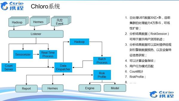 可以看到数据的来源主要有hermes、hadoop、以及前端抛过来的各种风控Event数据。Listener是用来接收各类数据,然后数据就会进入 CountServer 和 Real-Time Process系统,其中和RiskSession的数据就先进入Sessionizer ,该模块可以快速进行归约Session处理,根据不同的key归约成一个session,然后再提交给 实时处理系统进行处理。当Real Time Process 和 CountServer对数据处理好后,这个时候分成了两部分数据,一部分是处理的结果,还有一份是原数据,都会提交给Data Dispatcher,由它进行Chloro系统内部的数据路由,结果会直接进入到RiskProfile提供给引擎和模型使用。而原始数据会写入到Hadoop集群。