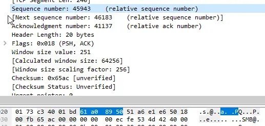 (图片说明:当前包的编号是45943,下一个数据包的编号是46183,由此可知,这个包的负载是240字节。)