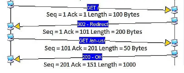 (图片说明:上图一共4次通信。第一次通信,A 主机发给B 主机的数据包编号是1,长度是100字节,因此第二次通信 B 主机的 ACK 编号是 1 + 100 = 101,第三次通信 A 主机的数据包编号也是 101。同理,第二次通信 B 主机发给 A 主机的数据包编号是1,长度是200字节,因此第三次通信 A 主机的 ACK 是201,第四次通信 B 主机的数据包编号也是201。)