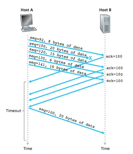 (图片说明:Host B 没有收到100号数据包,会连续发出相同的 ACK,触发 Host A 重发100号数据包。)