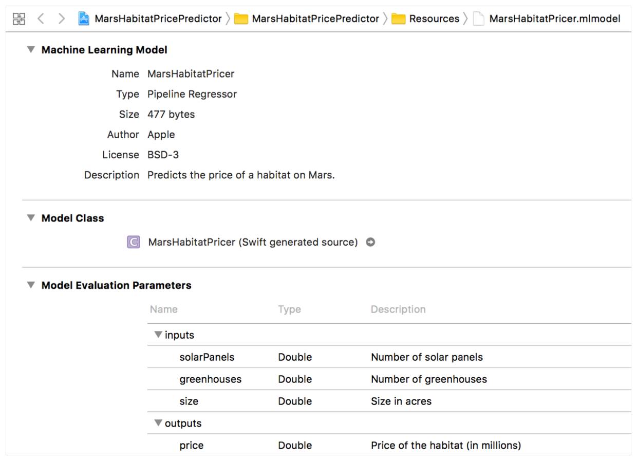 以用来预测火星殖民地价格的已训练模型 MarsHabitatPricer.mlmodel 为例: