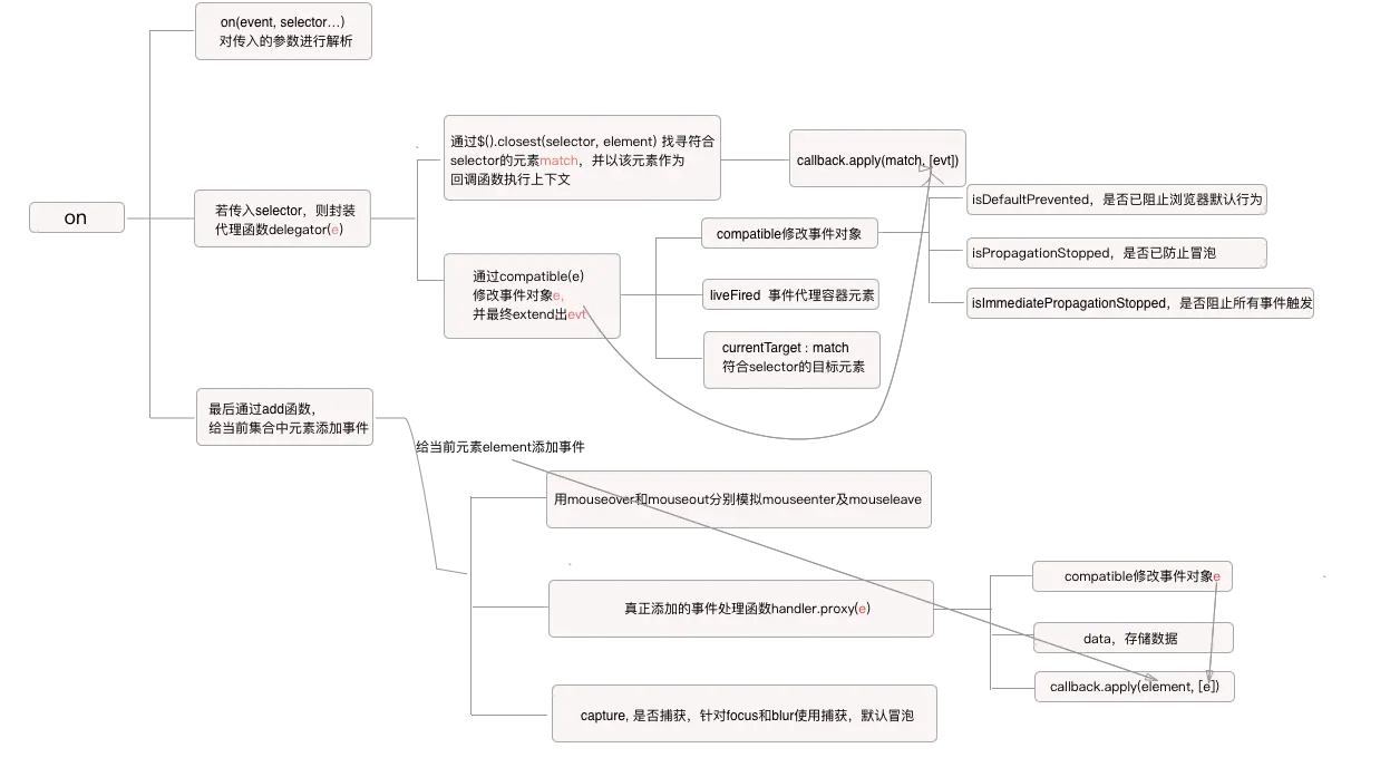 on(type, [selector], data, function (e) { ... }, true)还会有其他的写法,但是常见的可能就是这些,第二段代码就是处理这些参数以让后续的事件正确添加。