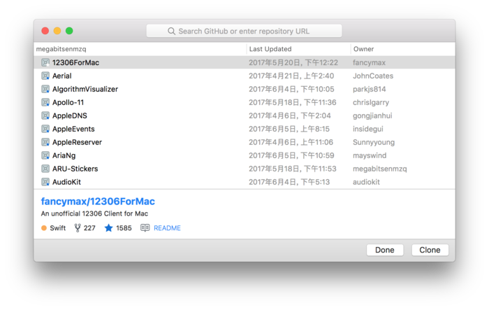 然后选择 Source Control/Clone,你可以在这里看到你维护和 Star 的所有项目。