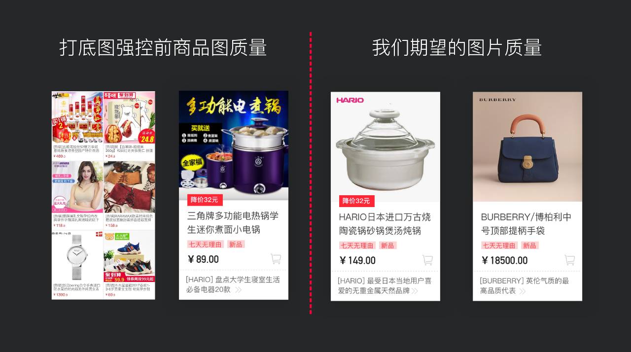为了避免首页出现下图左侧情况出现,我们制定了平台商品图规范输入给商家,强控产出:首页所有的商品都保证有一张白底图作为打底素材。同时为了保证优质商家品牌调性及平台丰富度,我们特地组织成了设计师审核小分队,大家一起来人工筛选出那些商品图有自己调性,品质高的商家,为他们开通绿色通道,允许不使用白底图,使用带有品牌特色的商品主图。