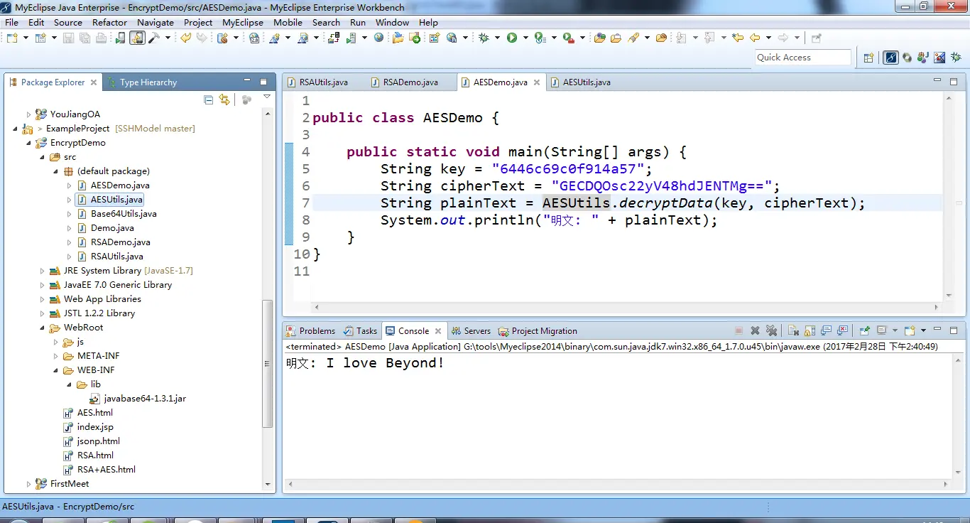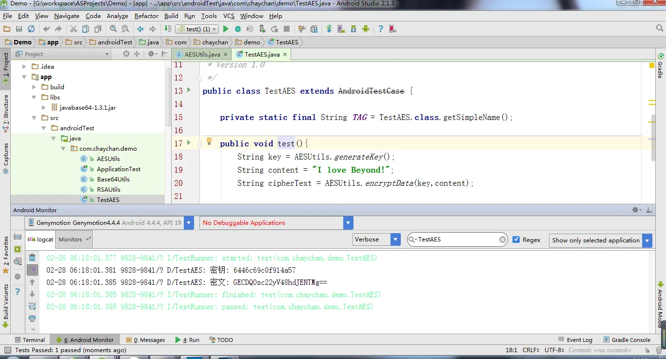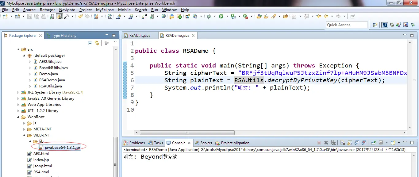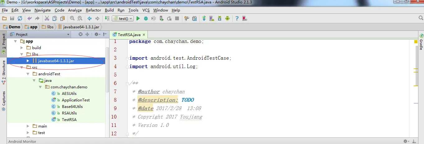 使用到的jar包都是javabase64-1.3.1.jar,相信不少人都知道,java中有自带的Base64算法类,但是安卓中却没有,之前出现的情况是,使用的Base64类不统一,比如在安卓客户端开发使用的Base64算法是使用第三方提供的jar包,而java服务端中使用的是JDK自带的Base64,导致从客户端传过来的密文,服务端解析出错。