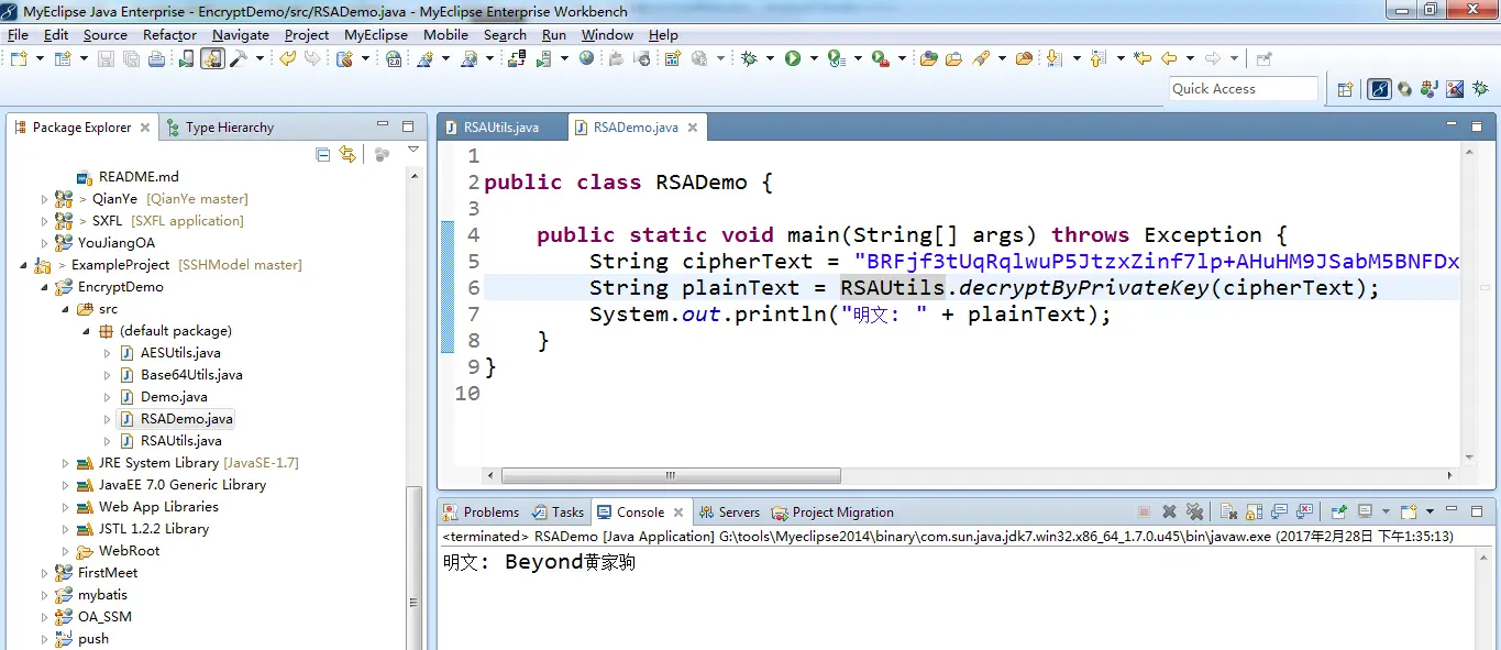 这里在客户端模拟加密的情况,对字符串”Beyond黄家驹”使用RSA加密,调用RSAUtils的encryptByPublicKey()方法,输出结果为: