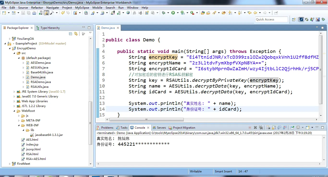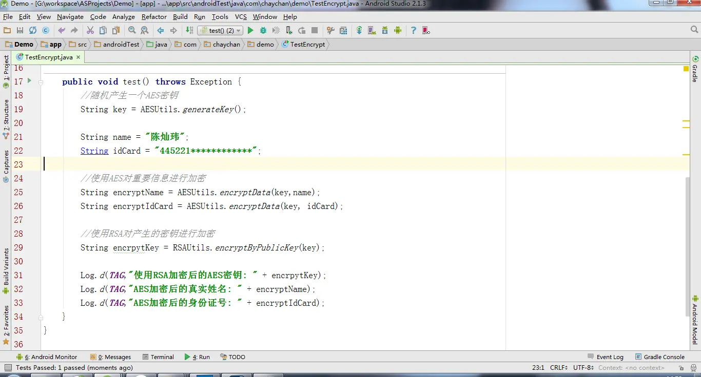 在这里虽然没有完全模拟数据传输过程,比如说客户端发起一个网络请求,传递参数给服务端,服务端接收参数并进行处理,也是为了让大家可以更加容易明白,所以这里只是进行简单的模拟。可以看到Android客户端端和 Java服务端的RSA加密解密算法是可以互通的,原因是他们所使用到的base64加密类是一致的,所以才可以实现加密和解密的算法互通。