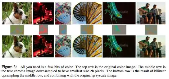 图3:你需要的只是一些颜色。顶行是原始彩色图像。中间行是降低采样率后的真实色度图像,尺寸缩小至28像素。底行是双线性提高中间行的采样率并结合原始灰度图像的结果。