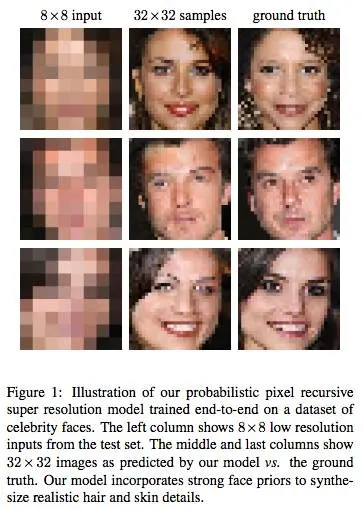 图1:用名人脸部图像数据集训练出来的超分辨率像素递归模型所生成的高分辨率图像。左侧为测试数据集所用的8x8低分辨率输入图像。中间为PixelCNN模型所输出的32x32高分辨率图像,右侧是原始的32x32分辨率图像。我们的模型优先整合脸部特征,而后去合成较为逼真的头发与皮肤方面的细节。