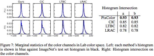 图7:实验室颜色空间中的颜色通道的边缘统计数据。左:每种方法的直方图以蓝色显示,ImageNet的测试数据集直方图以黑色显示。右图:颜色通道的直方图相交。