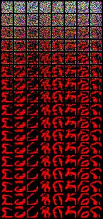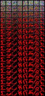 我的想法是,鉴于更少的架构决策,该网络相比一般的GAN可能更容易训练。事实上,它用MNIST确实可以工作。下图中每一栏都在展示:不同的噪音图像被逐渐推向红色MNIST数值的情形。
