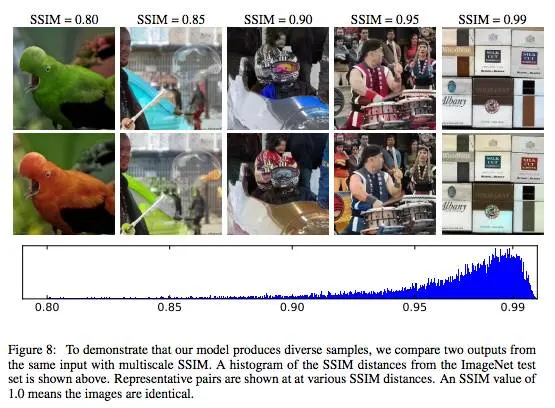 图8:为证明我们的模型可生成不同的样本,我们用多尺度SSIM对比了同一输入的两种输出。上图显示了ImageNet测试数据集的SSIM距离直方图。图中在多个SSIM间距上分别显示了每对图像。SSIM值为1表示两张图像完全相同。