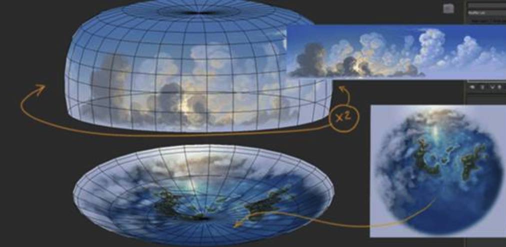 然而输出的全景图我们不打算放在一个球体上。因为有曲面就会有变形,但是天空部分因为是纯色,所以这部分形变是看不太出来的。可是如果这部分形变作用在建筑上就会非常明显。所以我们把球形换成一个「压扁柿饼形状」: