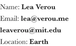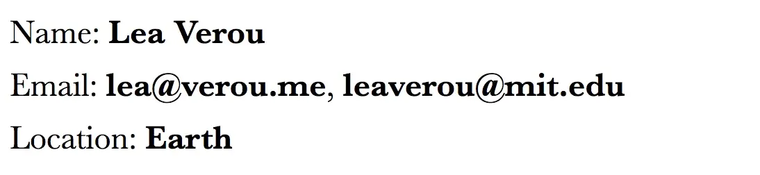 <dl><dt>Name:</dt><dd>Lea Verou</dd><dt>Email:</dt><dd>lea@verou.me</dd><dd>leaverou@mit.edu</dd><dt>Location:</dt><dd>Earth</dd></dl>