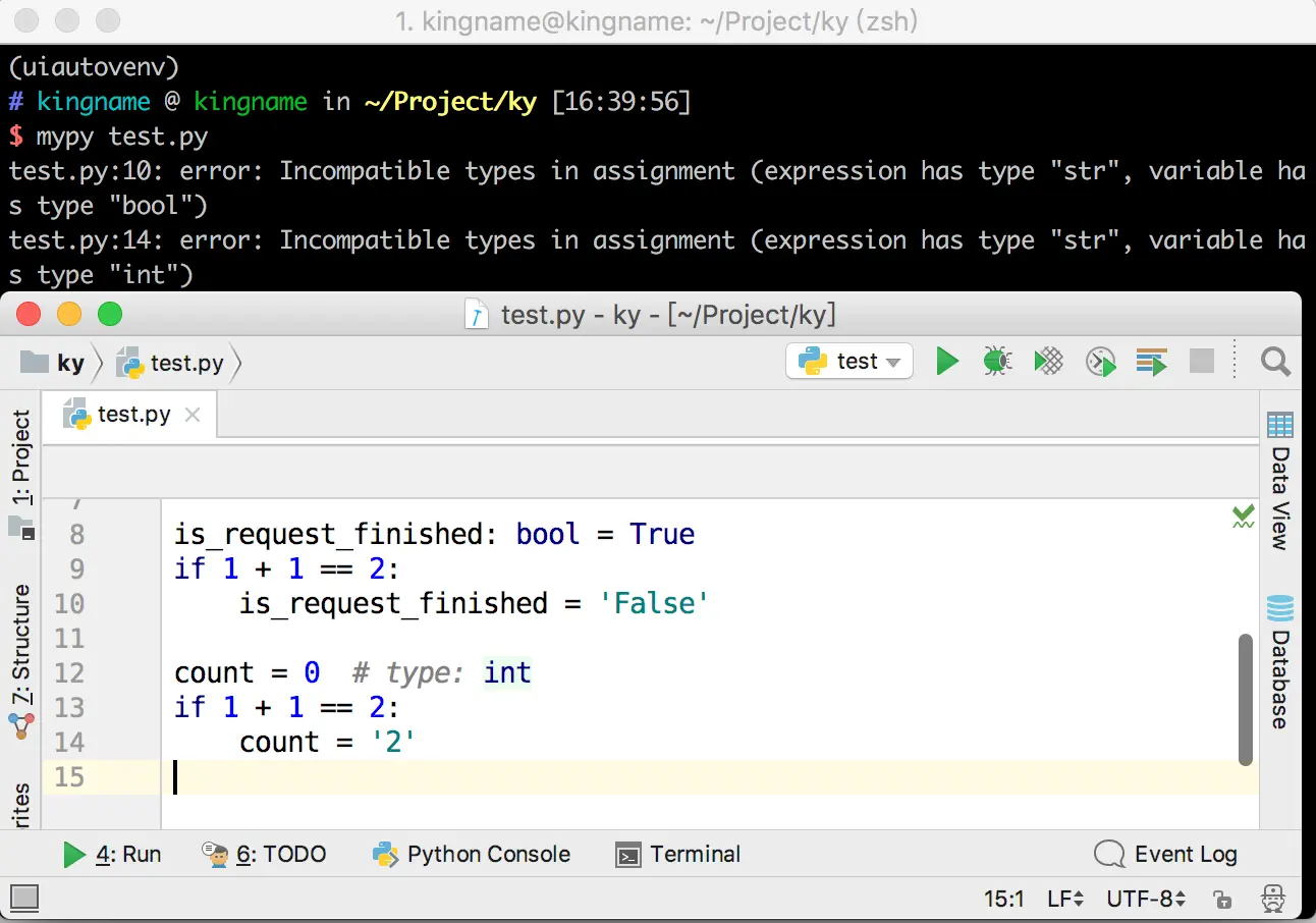 虽然PyCharm不能起到很好的提示作用,但是可以使用一个第三方库mypy来对代码做静态检查,其运行效果如下图所示,可以发现赋值的类型与声明的类型不一致(expression has type "str", variable has type "bool", 表达式的类型为“str”,变量的类型是“bool”)。