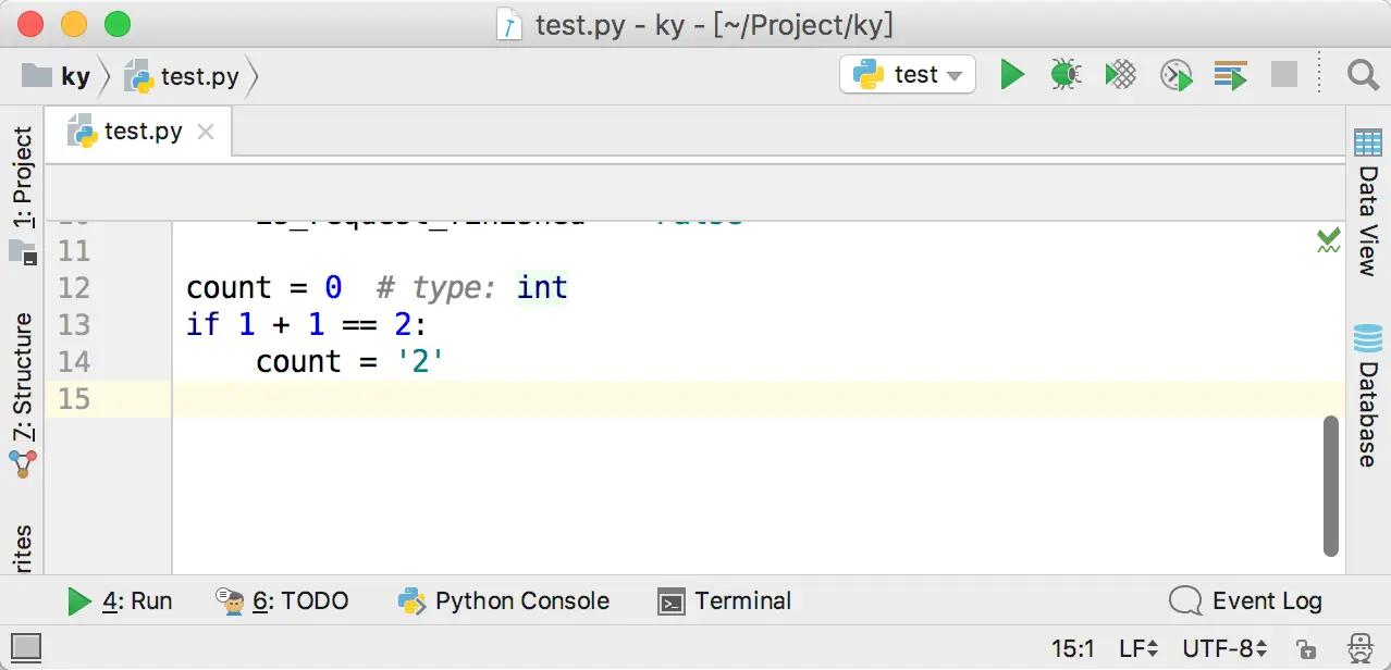 对于Variable Annotations,如下图所示,虽然目前PyCharm还不能很好地提示变量类型不对,但是人在读代码的时候,还是会起到一定的帮助。