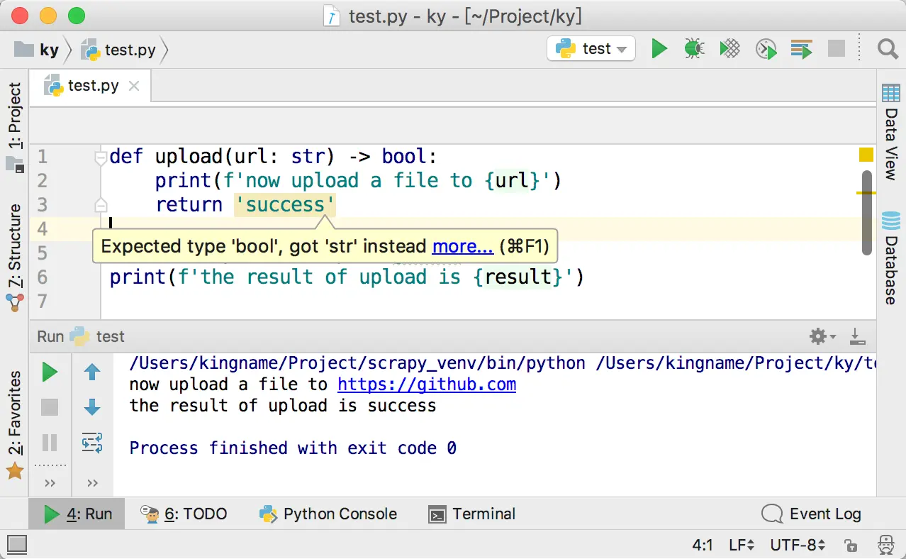 如果修改这个函数的返回值,让它不返回True 或者False,PyCharm 也会发出警告: