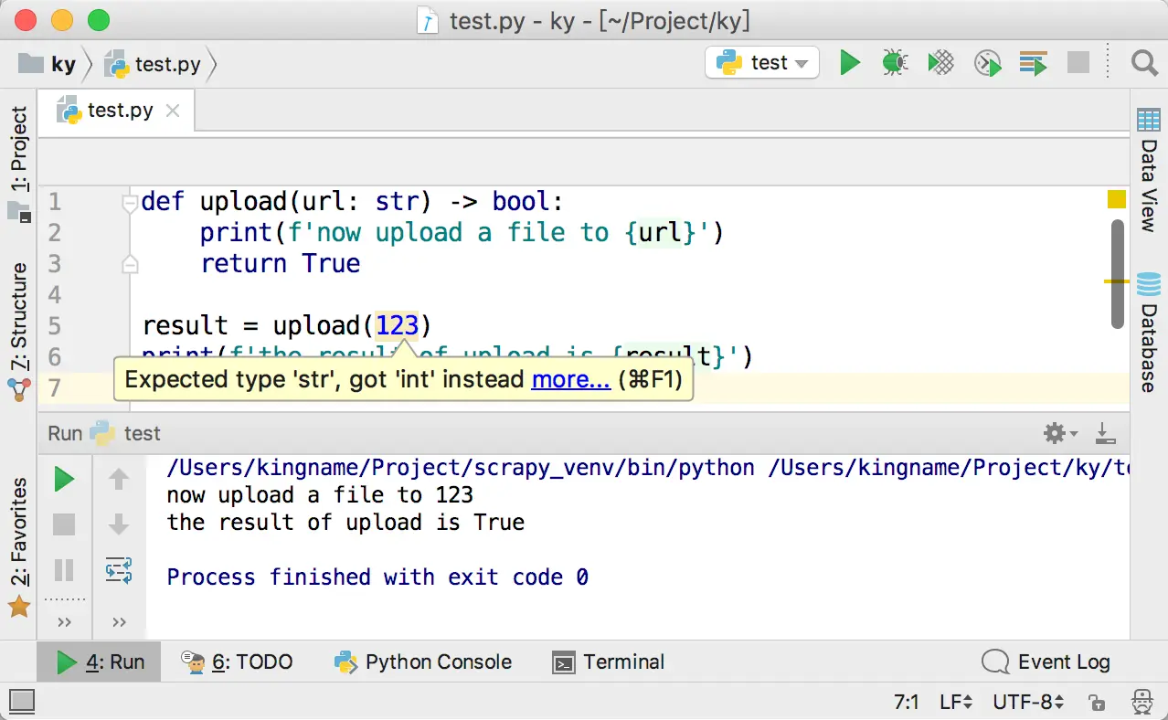 现在假设传递一个不是字符串的变量给upload函数,此时PyCharm就会提示类型有问题,如下图所示: