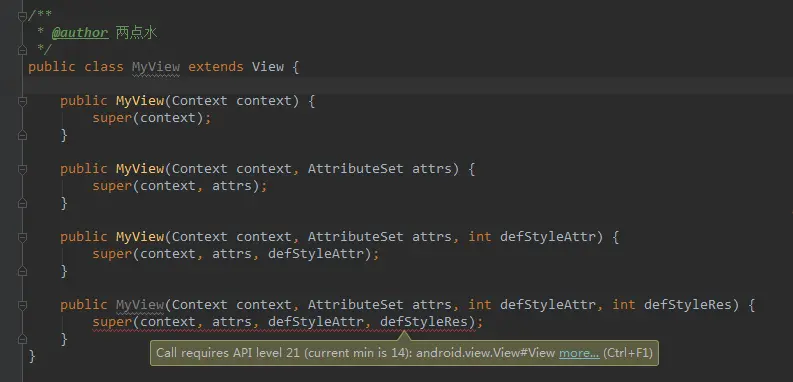 比如上面图片显示的自定义的 MyView ,继承 View 对象,如果我们想在普通的代码中新建一个 MyView,可以直接使用一个参数的构造函数,这也是大多数选择使用的。