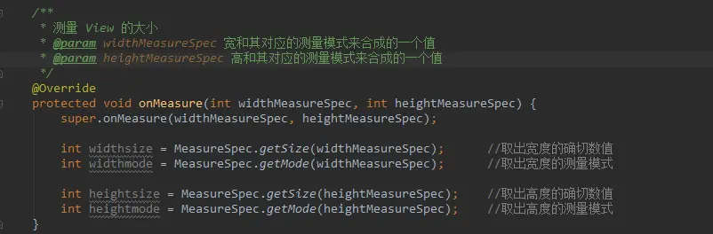 所以在确定控件大小时,需要判断 MeasureSpec 的 mode,不能直接用 MeasureSpec 的 size。在进行一些逻辑处理以后,调用 setMeasureDimension() 方法,将测量得到的宽高传进去供 layout 使用。