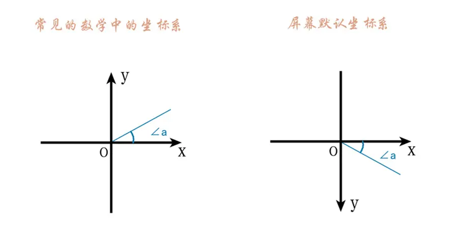 数学中常见的坐标系与 Android 系统上 View 的坐标系是有点差别的,Android 设备中,屏幕的左上角为坐标原点,向右为 x 轴增大方向,向下为 y 轴增大方向。