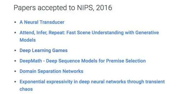 2016 年,Google Brain 团队参与了 ICML、NIPS 和 ICLR 等国际顶级机器学习会议,并在这些会议上发表了 27 篇论文。除机器学习领域的专业会议以外,还有很多论文被其他领域的会议所接受,例如自然语言处理领域的 ACL 和 CoNNL 大会、语音领域的 ICASSP 大会等。