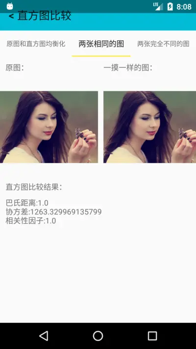 然后,再来比较两张完全一致的图片,可以看到他们的相关性因子是1.0,表示两者完全一致。