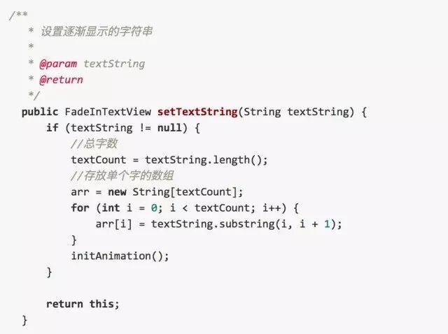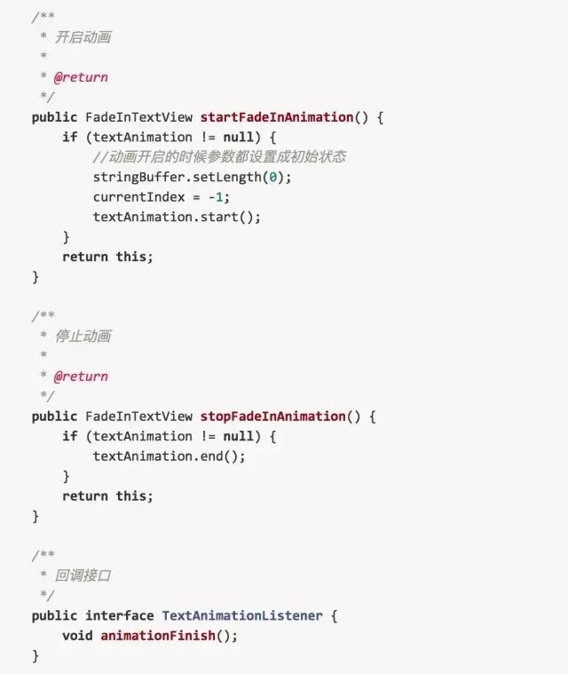 设置字符的方法少不了,接下来开启动画和停止动画,然后就是动画结束的回调。