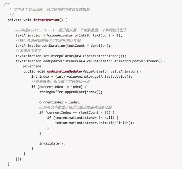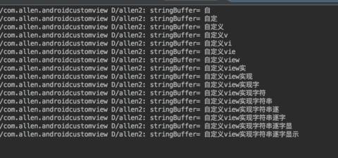 思路是这样的:为每个文字显示的时间设置一个固定值duration,我这里默认显示300毫秒,动画执行的总时间就是总共的字数乘以每个字显示的时间( textCount * duration),ValueAnimator.ofInt(0, textCount - 1)是为了根据这个字数的因子当做下标获取单个字符,每次追加到 stringBuffer.append(arr[index]),代码中我做了过滤重绘的判断,保证每次只绘制一遍,提升性能,因为我们的valueAnimator.getAnimatedValue()这个变化因子会不断变化及时转成int类型,每次也是有很多重复的,所以去重这一步就显得格外重要,我们可以看一下打印日志。