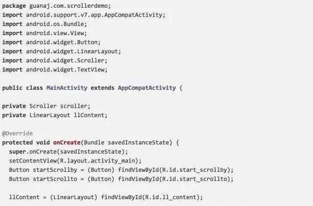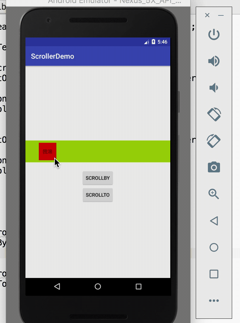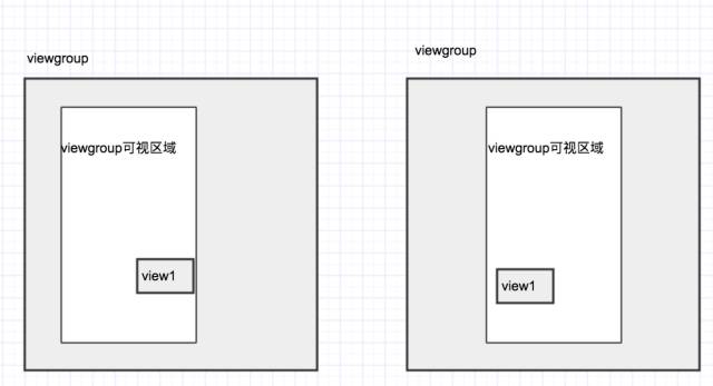 如上图:view1从右边往左下滚动,其实内部是将viewgroup的可视区域往右移动了,使用Scroller时,最长用的方法就是scrollTo 和ScrollBy,有关这两个方法的使用介绍和区别,网上其实有很多相关的文章。