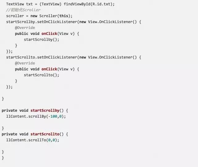 当时我也是一脸懵逼的,突然一想,不对,移动的并不是textview,而是linearlayout的可视区域,视觉上的textview向右滚,其实是linearlayout的可视区域向左移动,所以是-100;当点击startScrollto的时候,我们让linearlayout的可视区域回到原点。