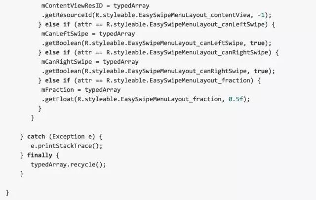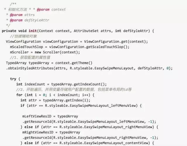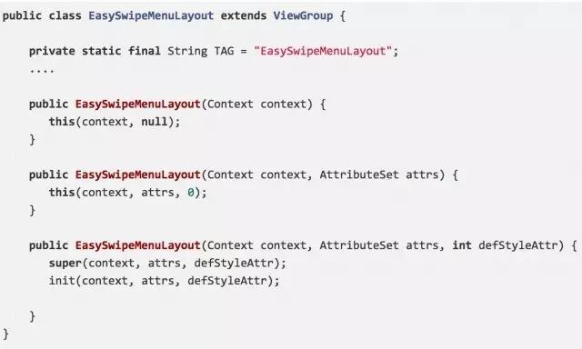 首先我们的EasySwipeMenuLayout通过继承ViewGroup进行实现,里面的构造方法通过不断的调用自身的构造方法,最终会调用init()方法做一些初始化方面的工作。