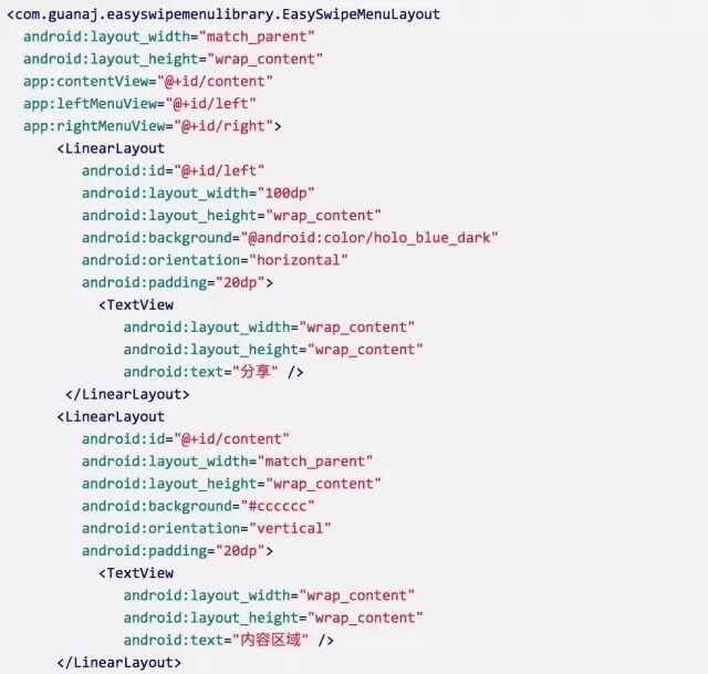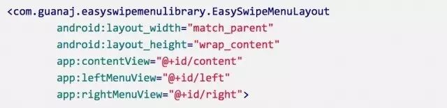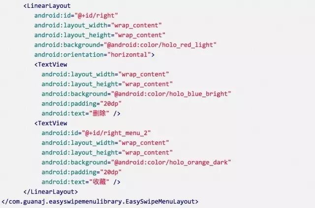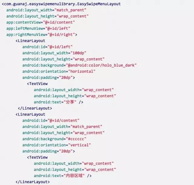 如下可以看到,就是通过id来绑定,让EasySwipeMenuLayout知道哪个childView是现实内容的,哪个是左边的菜单布局,哪个是右边的菜单布局。