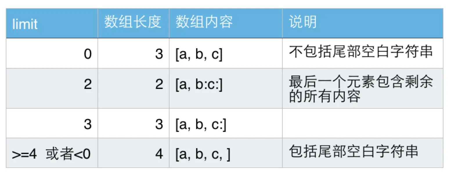 不带limit参数的split,其limit相当于0。关于limit的含义,我们通过一个例子说明下,比如字符串是"a:b:c:",分隔符是":",在limit为不同值的情况下,其返回数组如下表所示: