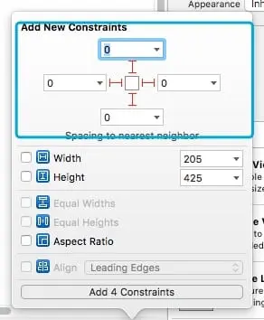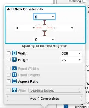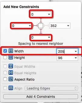 我们设置 SideMenuView的大小为 205x1000。宽度是固定的,但是高度不固定,我们使用自动布局。