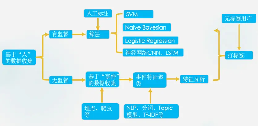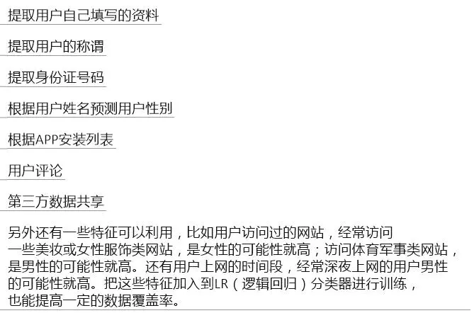 比如购买行为、位置包括常驻地出差地等、使用设备、社交属性等,这类一般都可以直接从日志中直接提取,加以简单的聚类算法辅助即可。