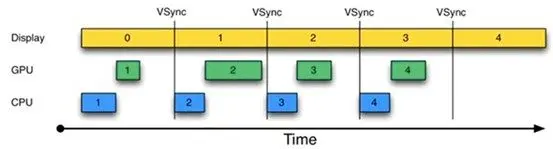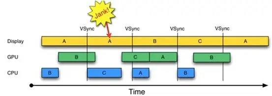 另外在上图第二个16ms时间段内,CPU无所事事,因为A Buffer被Display在使用。B Buffer被GPU在使用。注意,一旦过了VSYNC时间点,CPU就不能被触发以处理绘制工作了。