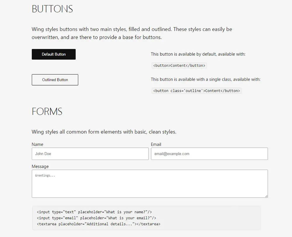 Wing 最好的地方,在于它针对默认元素提供了自动样式(auto-styling )功能。当你将Wing CSS 样式表放在你的项目之后,你会立刻看到改变。