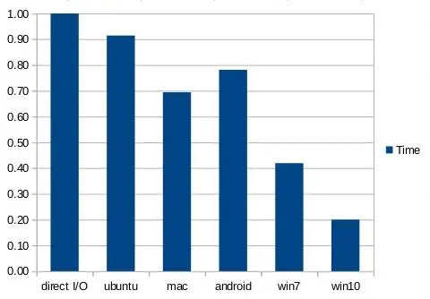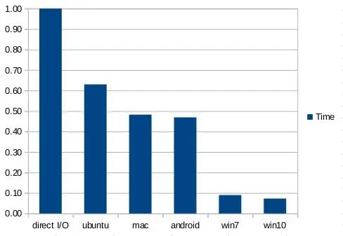 The chart below shows average time to read a blob from the SQLite database, relative to the time needed to read the same blob from a file in the filesystem. Smaller is better. The actual timings vary considerably from one system to another (the Ubuntu desktop is much faster than the Galaxy S3 phone, for example). This chart shows the ratio of the times needed to read blobs from SQLite divided by the times needed to read the same blob directly from disk. The left-most column in the chart is the time needed to read from disk divided by itself, and thus always has a value of 1.00. That column is included for visual reference only.