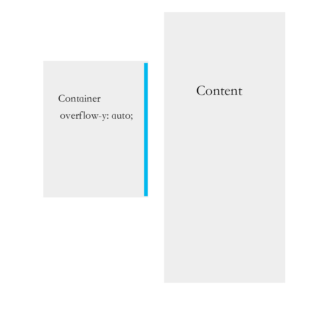 - 假定我们有一个容器Container(固定高度,并设置样式overflow-y:auto),容器中的内容为Content(内容高度超出容器的高度)。由于内容高度已经超过容器高度,那么容器Container就会出现滚动条。具体图示如下: