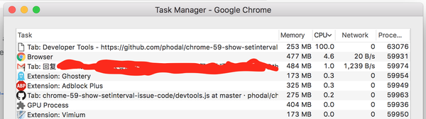 昨天下午休息的时候,发现我工作用的 Mac Mini 在疯狂地散热中,打开 Activity Monitor 发现是 Chrome 浏览器导致的,再打开 Chrome 的 Task Manager 发现是 Developer Tools,如下图所示: