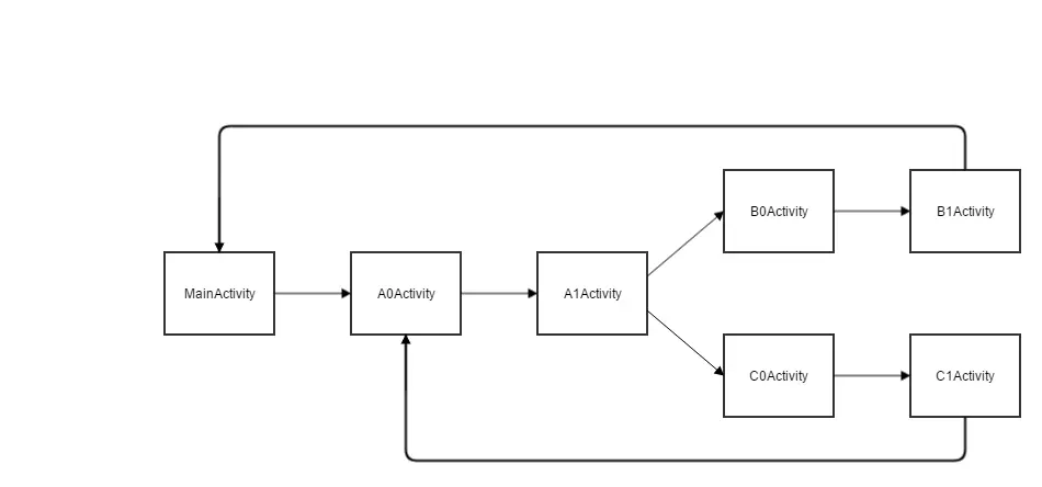 要测试肯定要先写demo,在这里先准备demo,里面的Activity跳转关系是这样的: