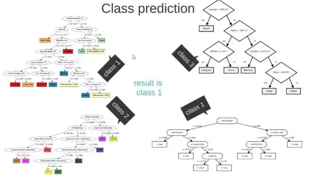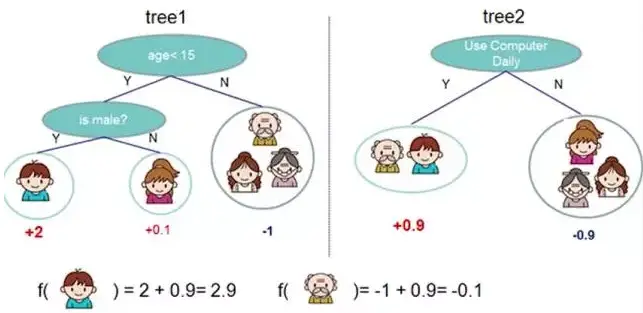 下图,左右两个决策树,单个看是效果不怎么好的,但是把同样的数据投入进去,把两个结果加起来考虑,就会增加可信度