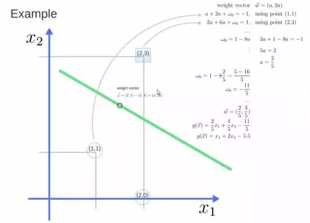 得到 weight vector 为(a,2a),将两个点代入方程,代入(2,3)另其值=1,代入(1,1)另其值=-1,求解出 a 和 截矩 w0 的值,进而得到超平面的表达式。