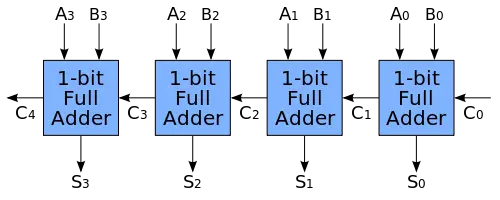 事实上我们知道程序中通常会至少使用8bit来表示一个数值,比如ASCII码表。而所谓的全加器其实就是级联多个1bit加法器完成工作,前一加法器的进位Cout作为下一加法器的Cin。