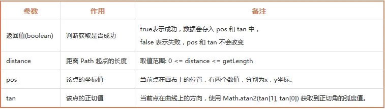 - flags,矩阵的类型,有两种,PathMeasure.TANGENT_MATRIX_FLAG正切,PathMeasure.TANGENT_MATRIX_FLAG位置