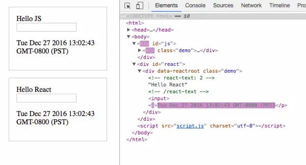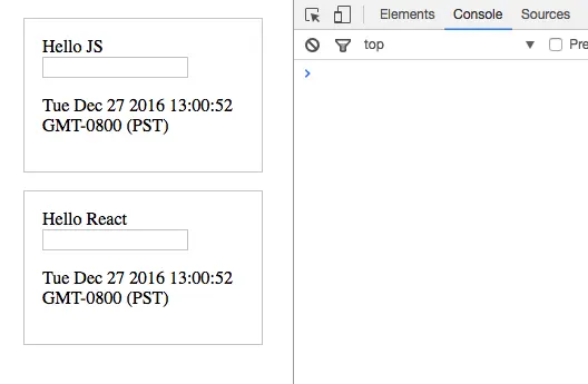 现在原生 JS 和 React 在页面上仍旧显示相同的内容。