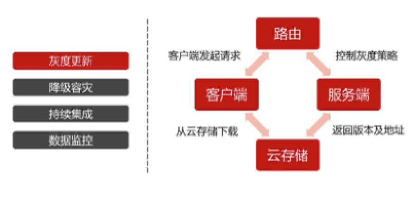 我们把降级容灾定义为两种:一种叫被动降级,一种叫主动降级。所谓的被动降级是指客户端确实不支持 RN 框架,每次加载 RN 框架都会出现问题,那必须要进行被动的降级,跳转到对应的 H5 页面,使得对业务的影响降到最低。这种降级逻辑是在客户端当中做处理的,就是前面介绍的兼容性检测。第二种是主动降级,很可能在业务开发的时候会发现一些上游的接口出现了问题,导致客户端中的某项业务不能正确地运行,这个时候就需要由服务端控制对这项业务进行精准的降级。我们会支持多个维度灵活的配置,可以根据客户端的版本号、客户端的型号,配置灰度比例、白名单,精准地对某些用户的某些业务或者某些地区的某些用户进行降级,减少业务上的损失。在一些非常大的促销的时候,像双 11、618 这种峰值非常高的时候,可能会采用这种方式。