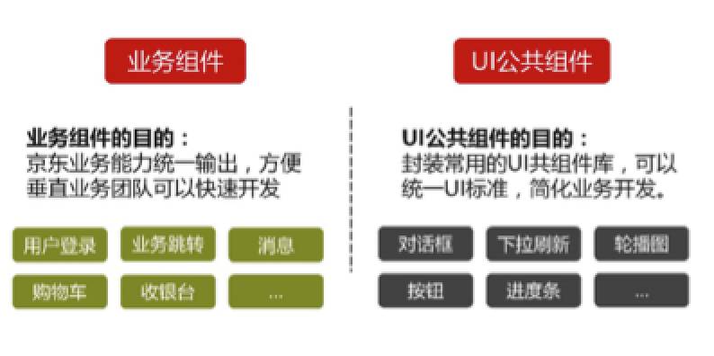 我们也结合自己的业务做了一套通用组件库的封装,例如京东当中的用户登录、购物车、收银台等等业务,在 RN 中做了一套组件的封装。把所有的接口都提供了 JS 的 API,样式和交互像常用的下拉刷新、对话框、按钮等等,也提供了一套通用的样式组件给开发者。在做业务开发的时候,完全不需要关心这些样式怎么画、颜色怎么搭配,只需要关注业务逻辑。剩下的事情由框架做,这可以提升整个业务开发的效率。